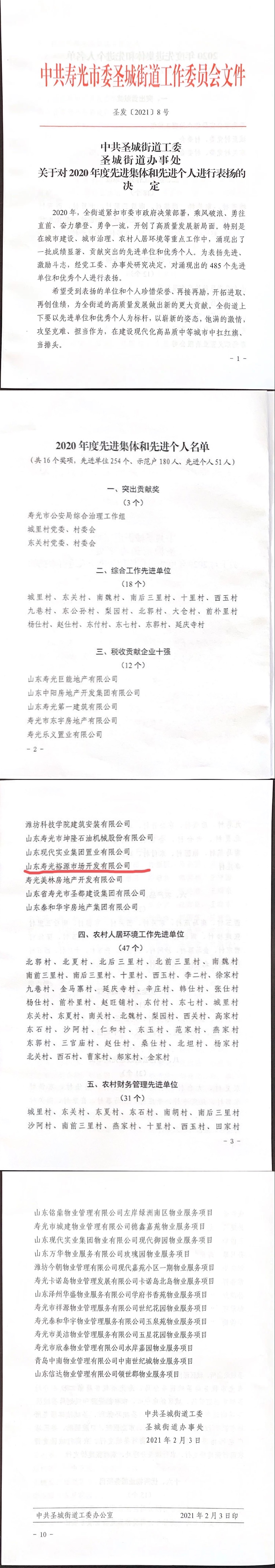 2021年3月,新正泰控股公司山東壽光裕源市場開發(fā)有限公司被中共壽光市圣城街道工作委員會授予“稅收貢獻企業(yè)十強”榮譽稱號。